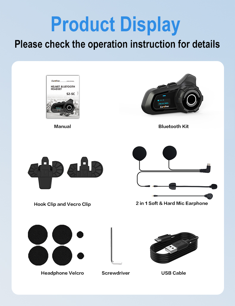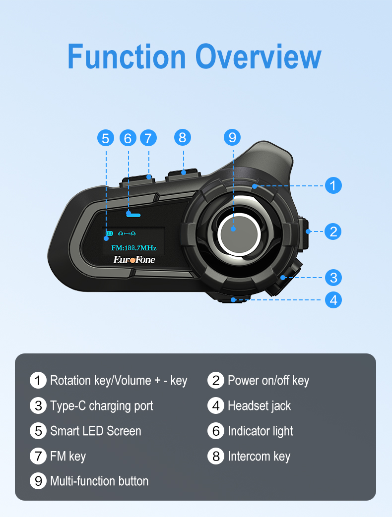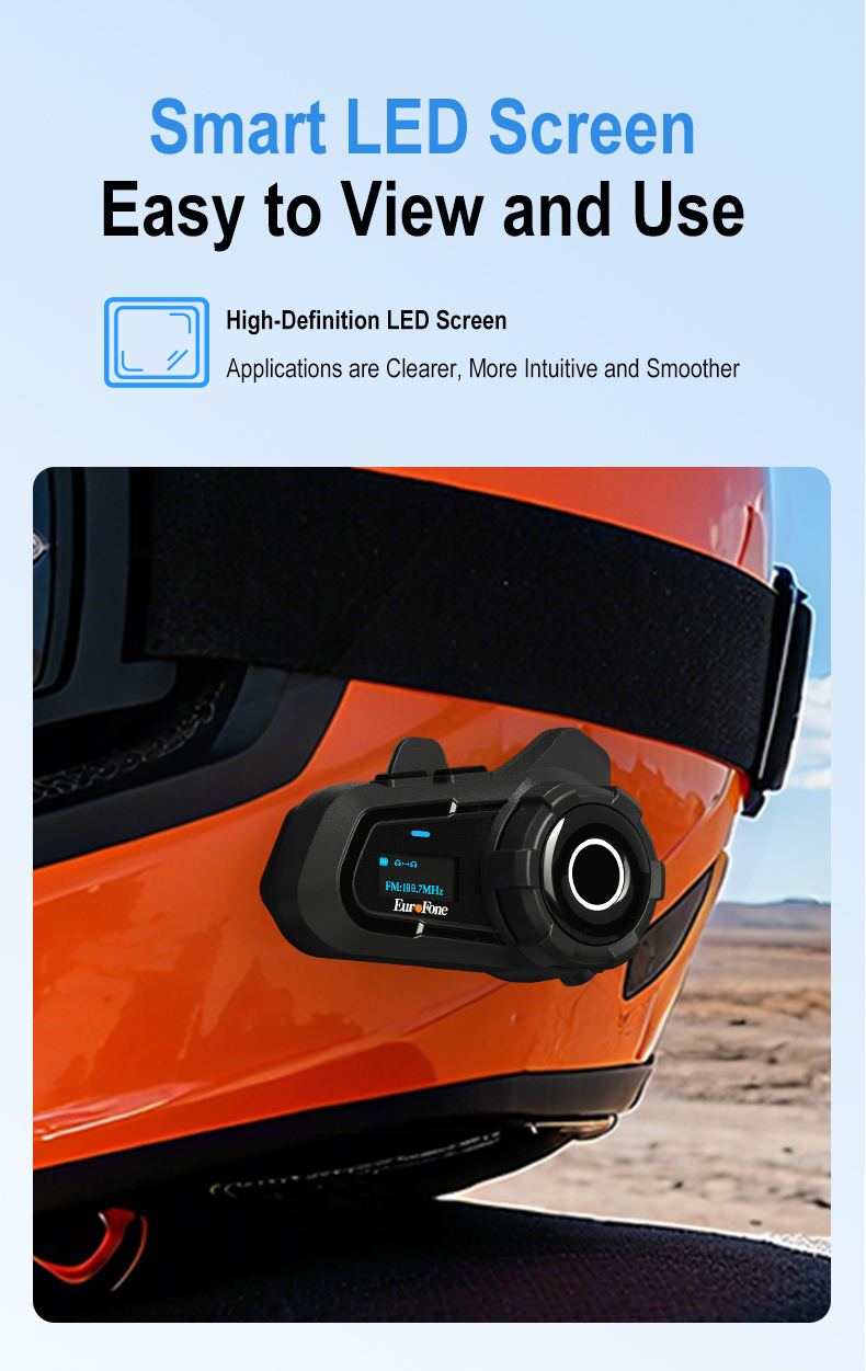 【LED Screen】The motorcycle bluetooth intercom are equipped with a display screen that shows all the information you need, including battery capacity, bluetooth pairing state, FM channel and so on. You no longer have to worry about any complex operations.