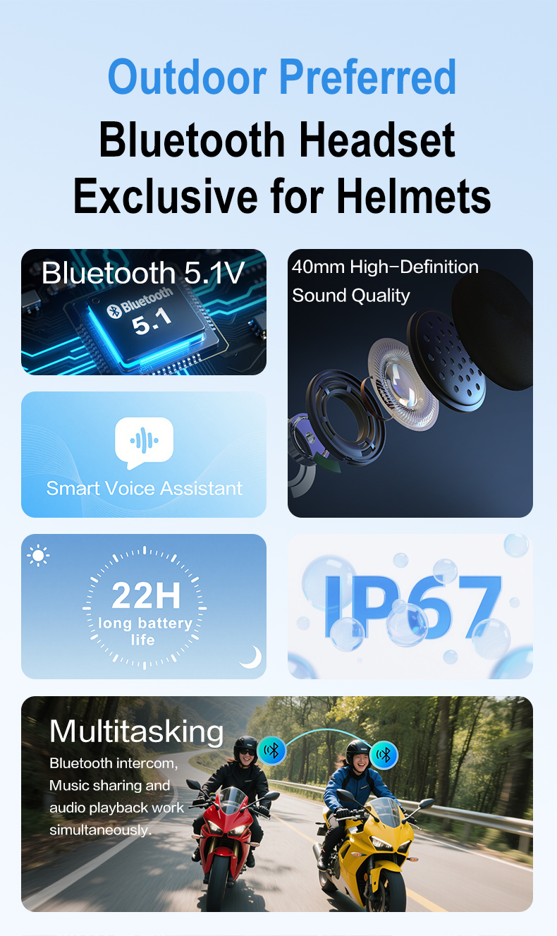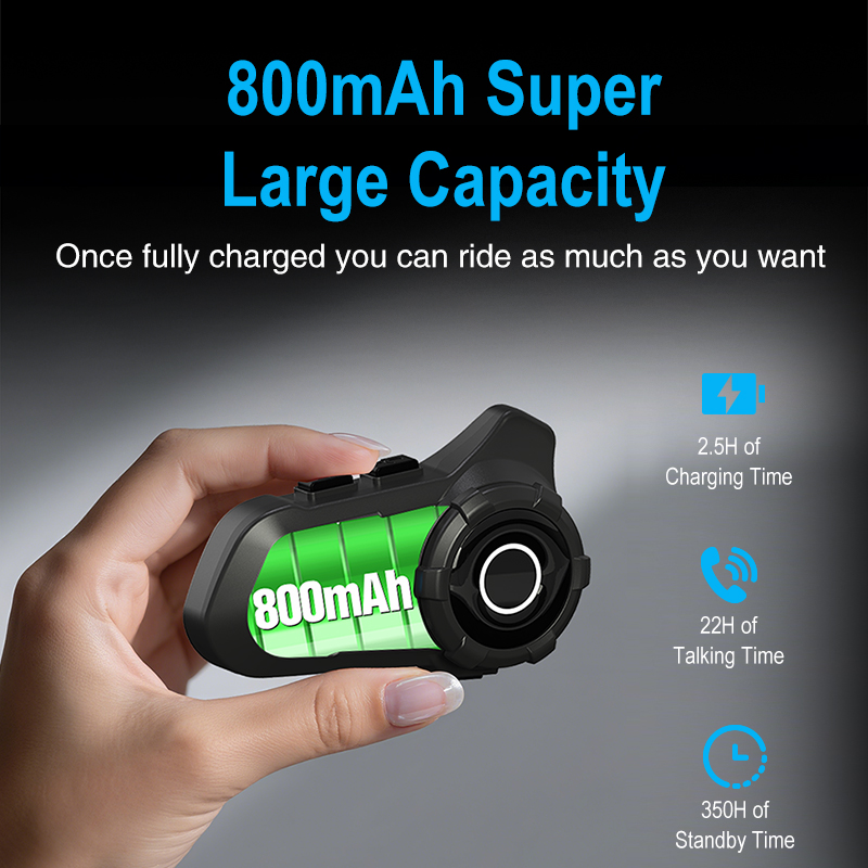 【Very Super Range】Helmet Headset Wireless runs on 800mAh large rechargeable battery, supports TYPE-C fast charging, just charge for 2 hours, the working time can reach 20 hours and the standby time can reach 18 months, support to display battery on mobile phone. You don't have to worry about battery life.