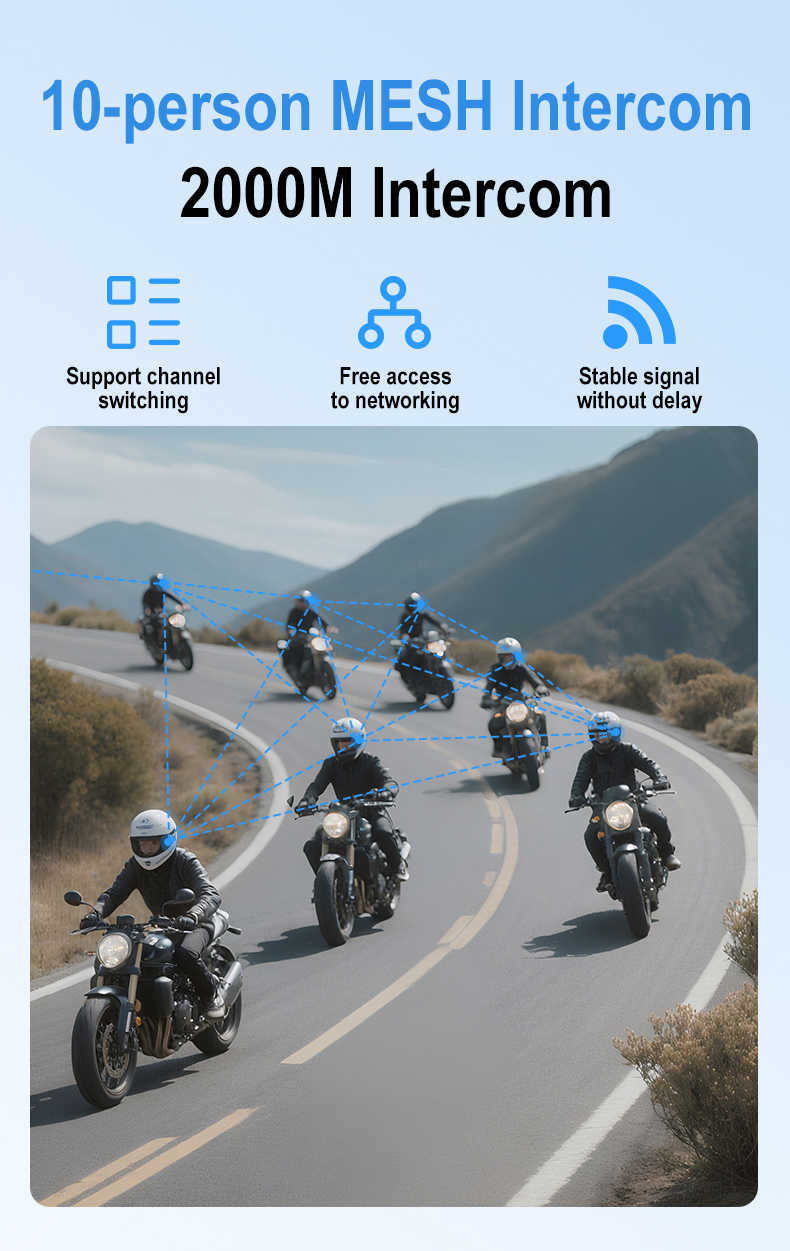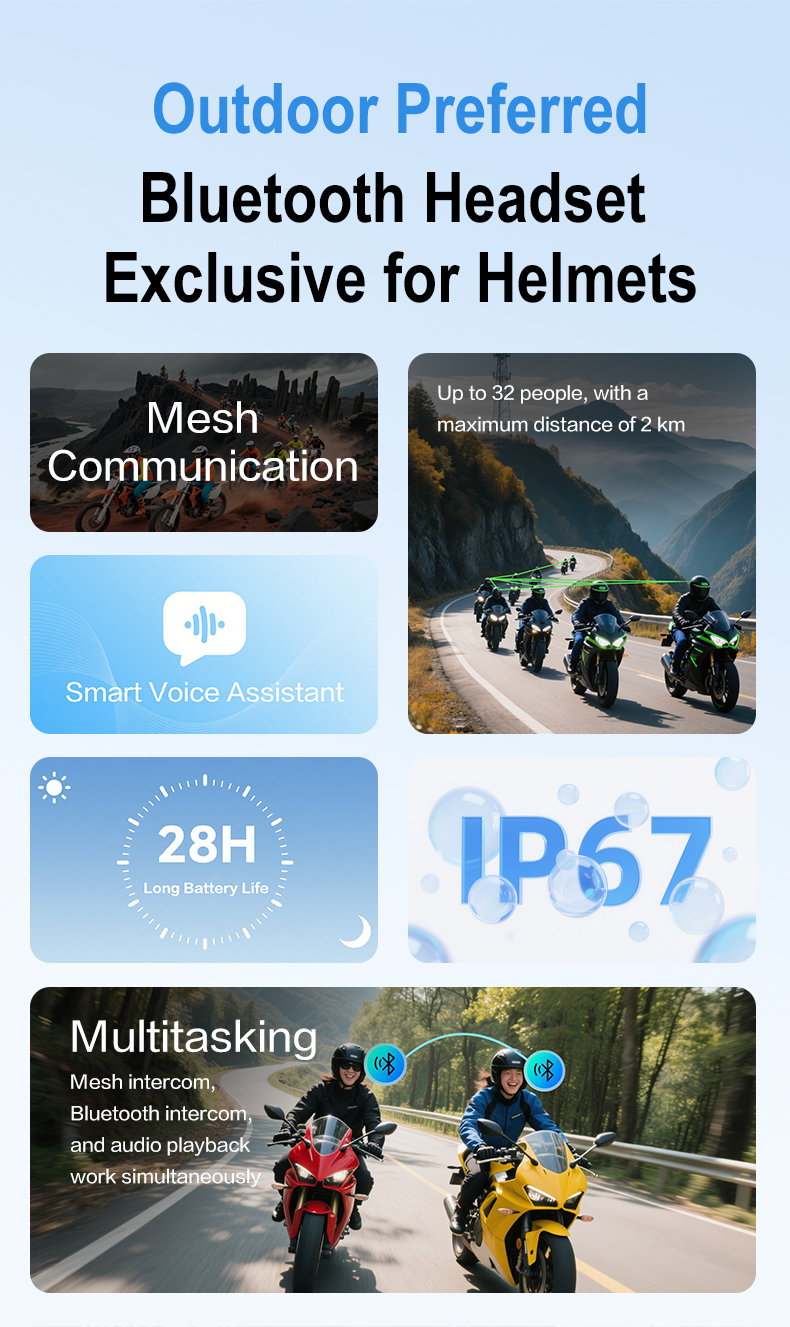 [32 Riders Group Mesh 3.0 Intercom& One-click Connection]: Experience seamless communication with the latest Mesh intercom 3.0 technology.The BT18 Mesh motorcycle bluetooth headset supports up to 32 riders at the intercom range of 3km in a mesh network, ensuring uninterrupted connectivity and crystal-clear audio transmission, group communication and coordination on the road. Simplify pairing with one-click-to-connect functionality, eliminating the hassle of manual pairing and ensuring quick and easy setup before hitting the road.