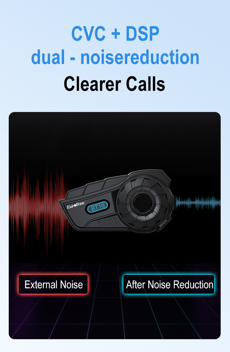 [DSP/CVC and Microphone Noise Cancelling & 40mm Hi-fi Stereo speaker]: Enjoy crystal-clear audio quality during calls and intercom conversations with DSP/CVC noise reduction technology, effectively filtering out background noise for a superior listening experience. Amd with 40mm Hi-fi Speaker and professionally tuned audio, the BT18 Mesh motorcycle Helmet Speakers presents every detail with clarity and vibrancy. The bass is deep and powerful, the mid-range and high notes are clear, delivering a breathtaking audio experience.