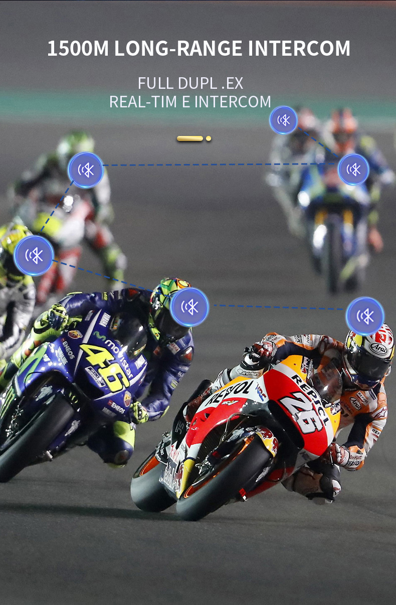 【Motorcycle Helmet Bluetooth Headset Communication System】 Adopted full duplex call, this 2-way Bluetooth motorcycle headset supports any 2 of paired riders to talk at one time in a maximum intercom range of 1500 meters (no obstacles in a straight line). Besides, it allows up to 6 riders to pair together easily, including a host and 5 submachines.